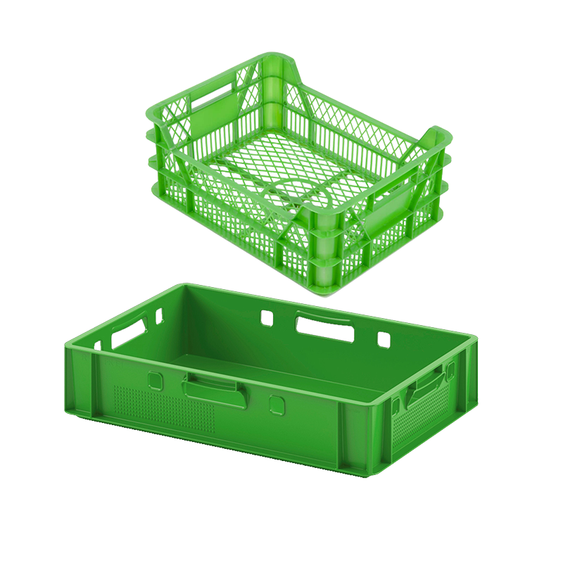Ящик для хранения овощей пластиковый имеет перфорированные стенки и дно, что снижает вес изделия, а также обеспечивает естественную проветривание содержимого. Для удобства ручной переноски присутствуют открытые ручки. Конструкция так же поддерживает штабелирование.