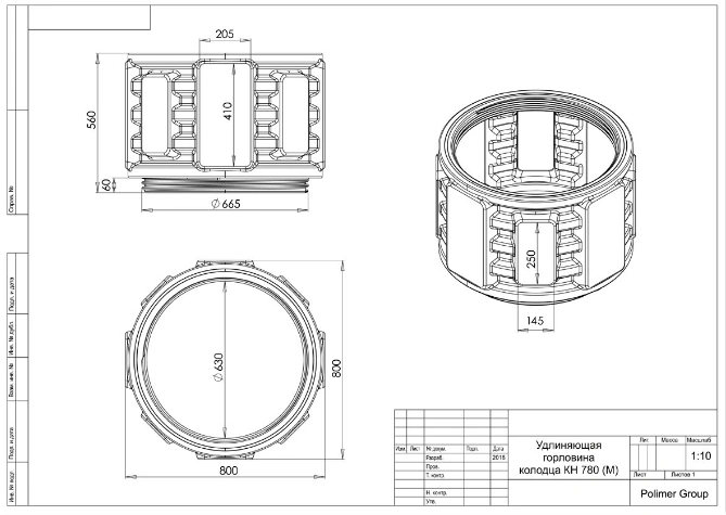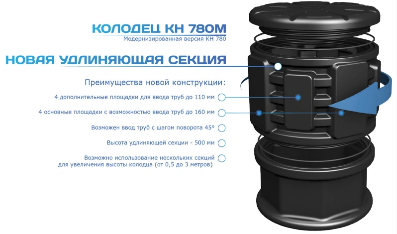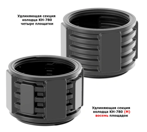 Элемент колодца КН-780, позволяет увеличить высоту колодца на 500 мм. Устанавливается на основание колодца с помощью резьбового соединения.